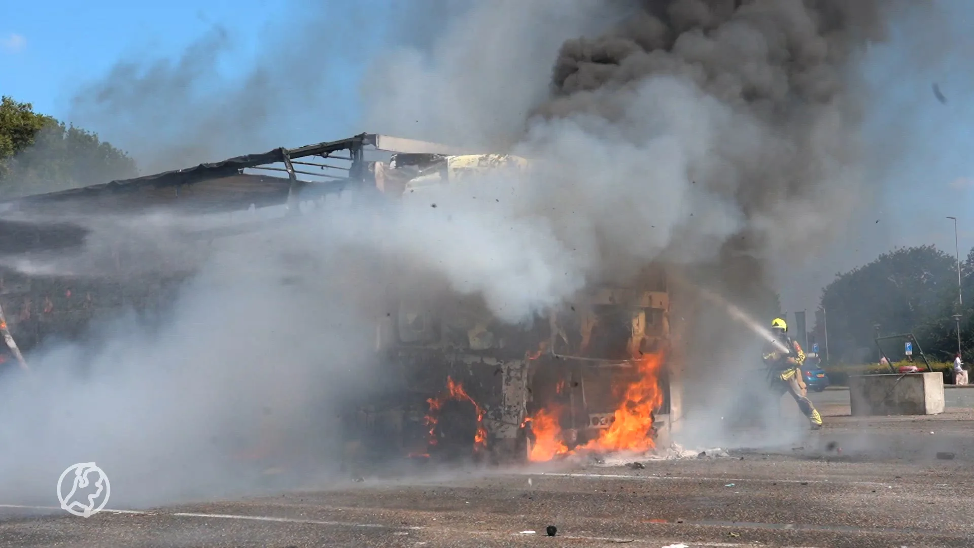 Op een parkeerplaats langs de snelweg kan de brandweer de vrachtwagen niet meer redden.