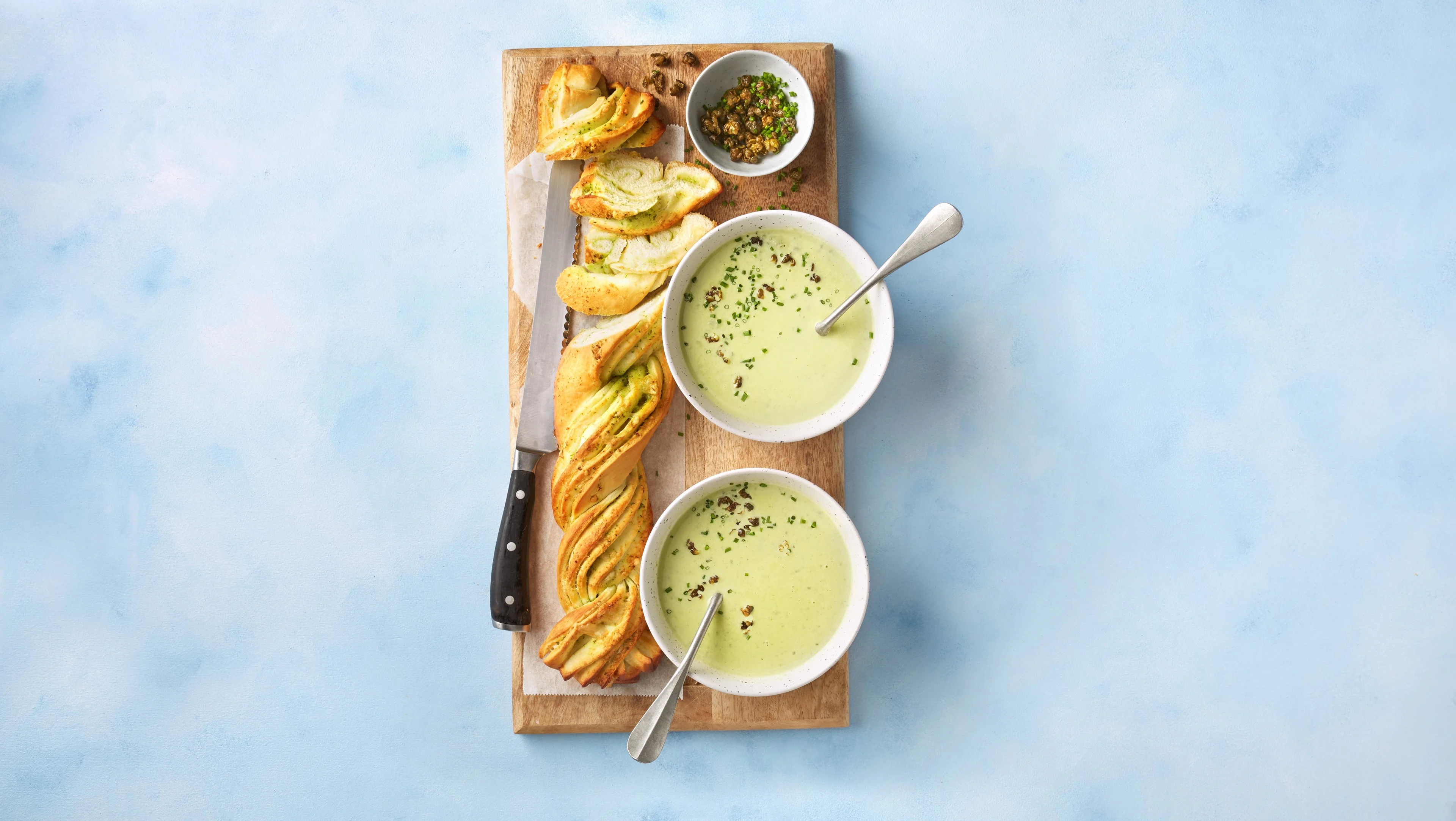 Deze soep smaakt romig en fris tegelijk. Ook laat Roberta zien hoe je zelf bieslookbrood maakt van pizzadeeg. En de gebakken kappertjes maken het gerecht helemaal af.