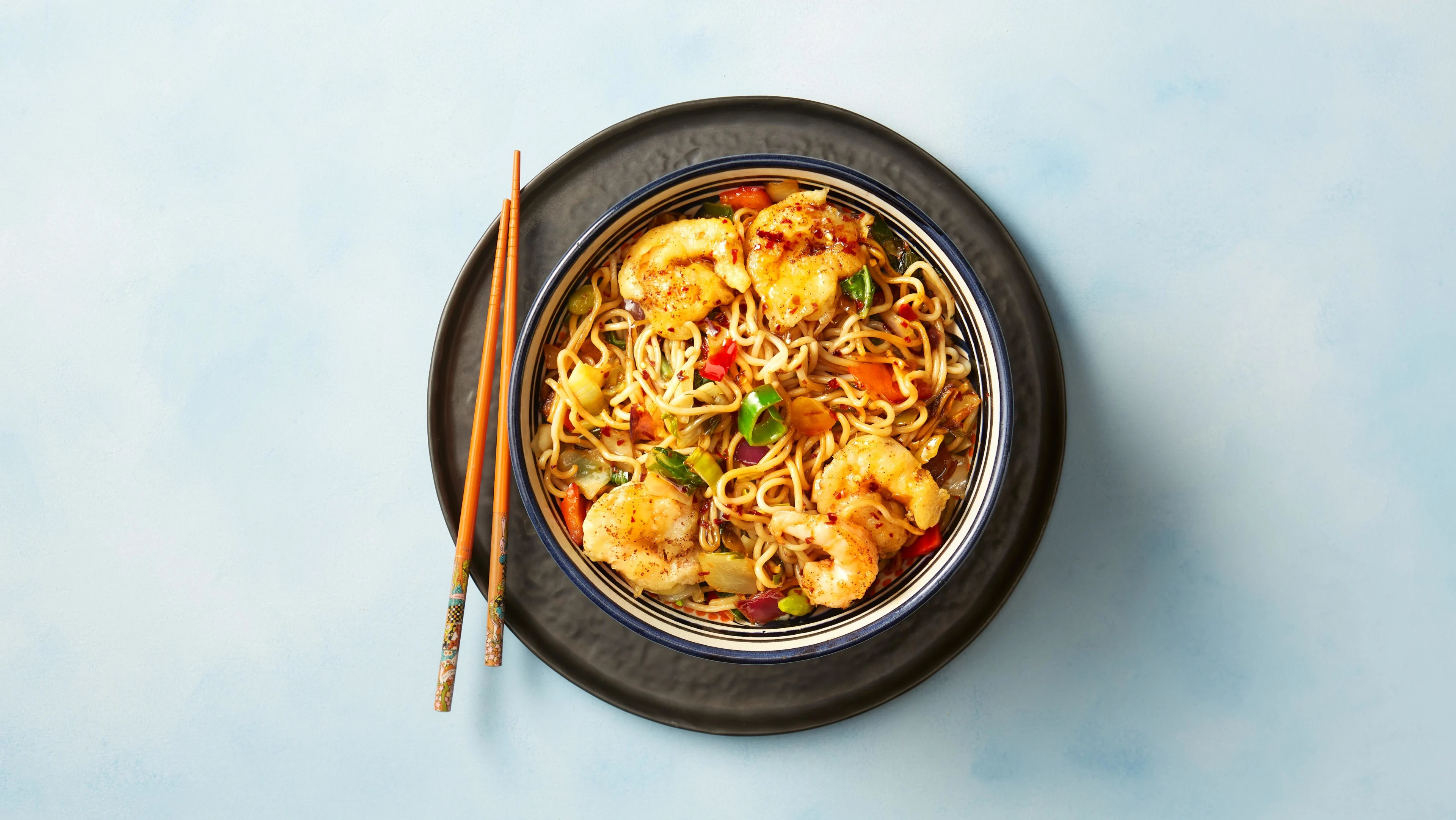 Roberta wokt een heerlijk oosters smaakbommetje met onder andere garnalen, noedels, roerbakgroenten, sojasauas en wat chilivlokken voor flink wat pit.
