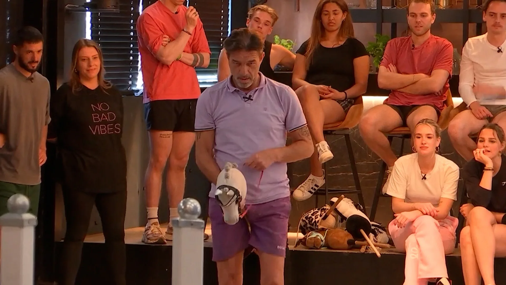 De deelnemers doen een wedstrijd hobbyhorsen.