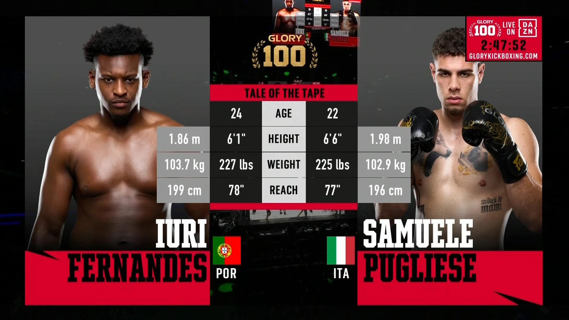 Tijdens GLORY 100 op 14 juni 2025 in Rotterdam Ahoy stonden Iuri Fernandes en Samuele Pugliese tegenover elkaar in een LHS reservegevecht, met een knallende knock-out overwinning voor Fernandes.