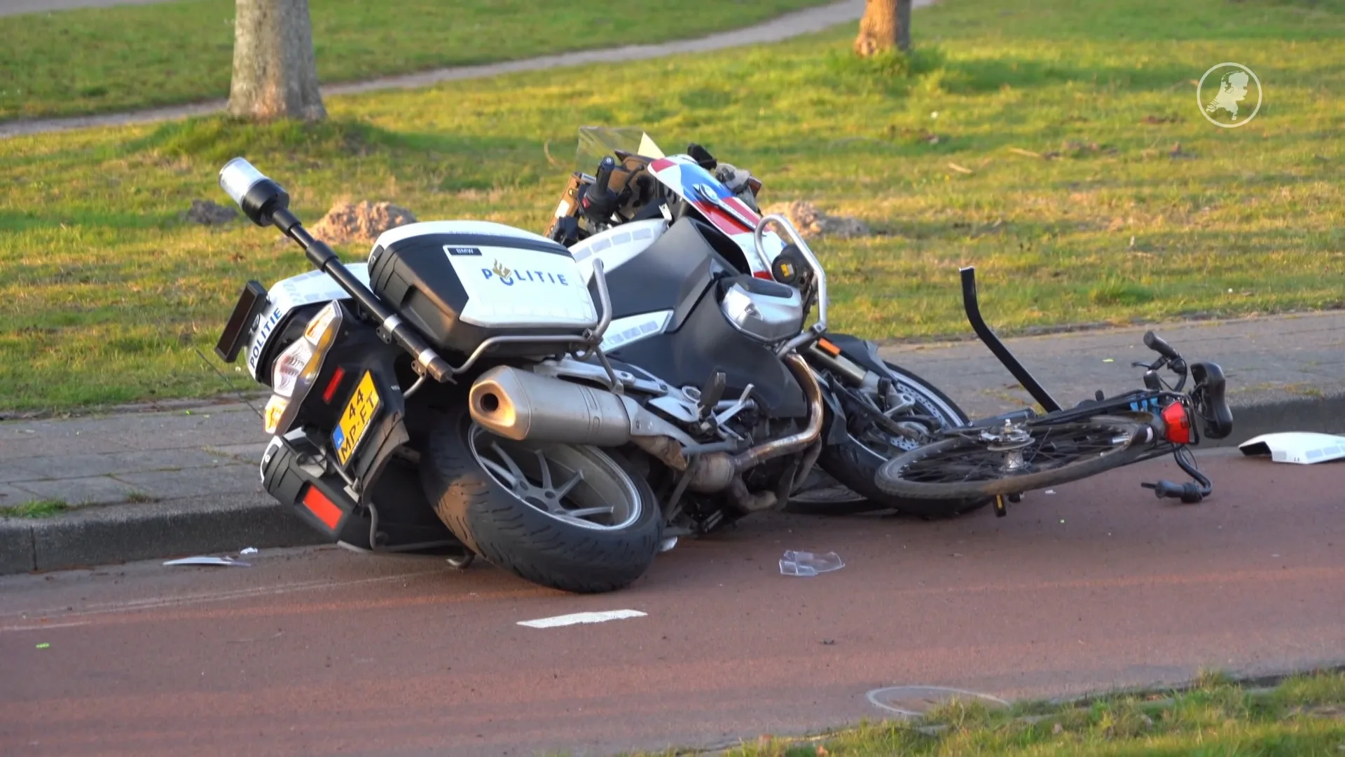 Op een fietspad bij de Kluiverboom in Groningen raakten een motoragent en een fietser donderdagavond ernstig gewond bij een frontale botsing. Op beelden is te zien hoe hulpdiensten groots uitrukken en zichtschermen plaatsen rond het ongeluk. De politie onderzoekt de toedracht.