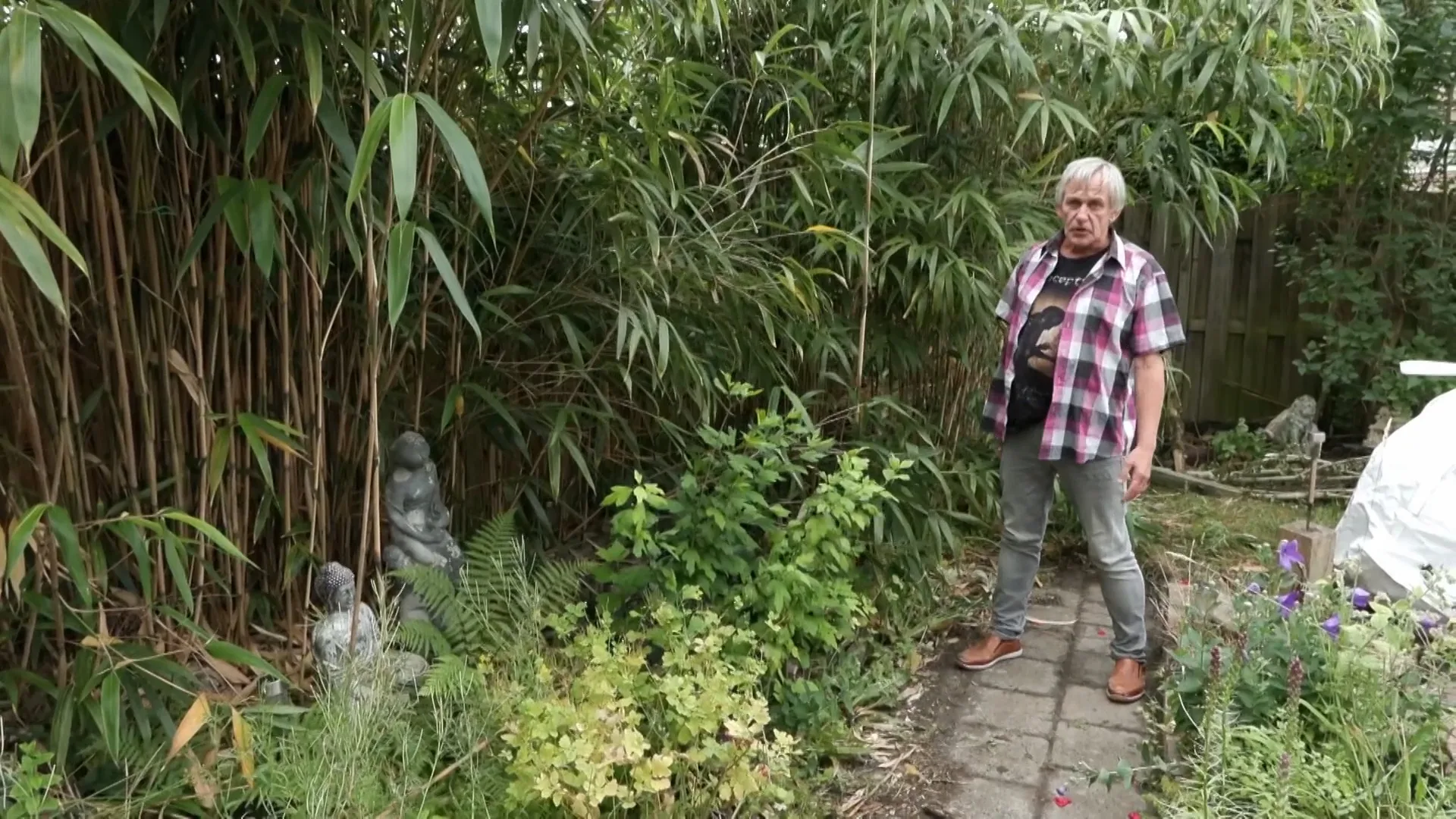Buurman Peter laat de tuin zien, die volgens hem door de buren in puin is gelegd.