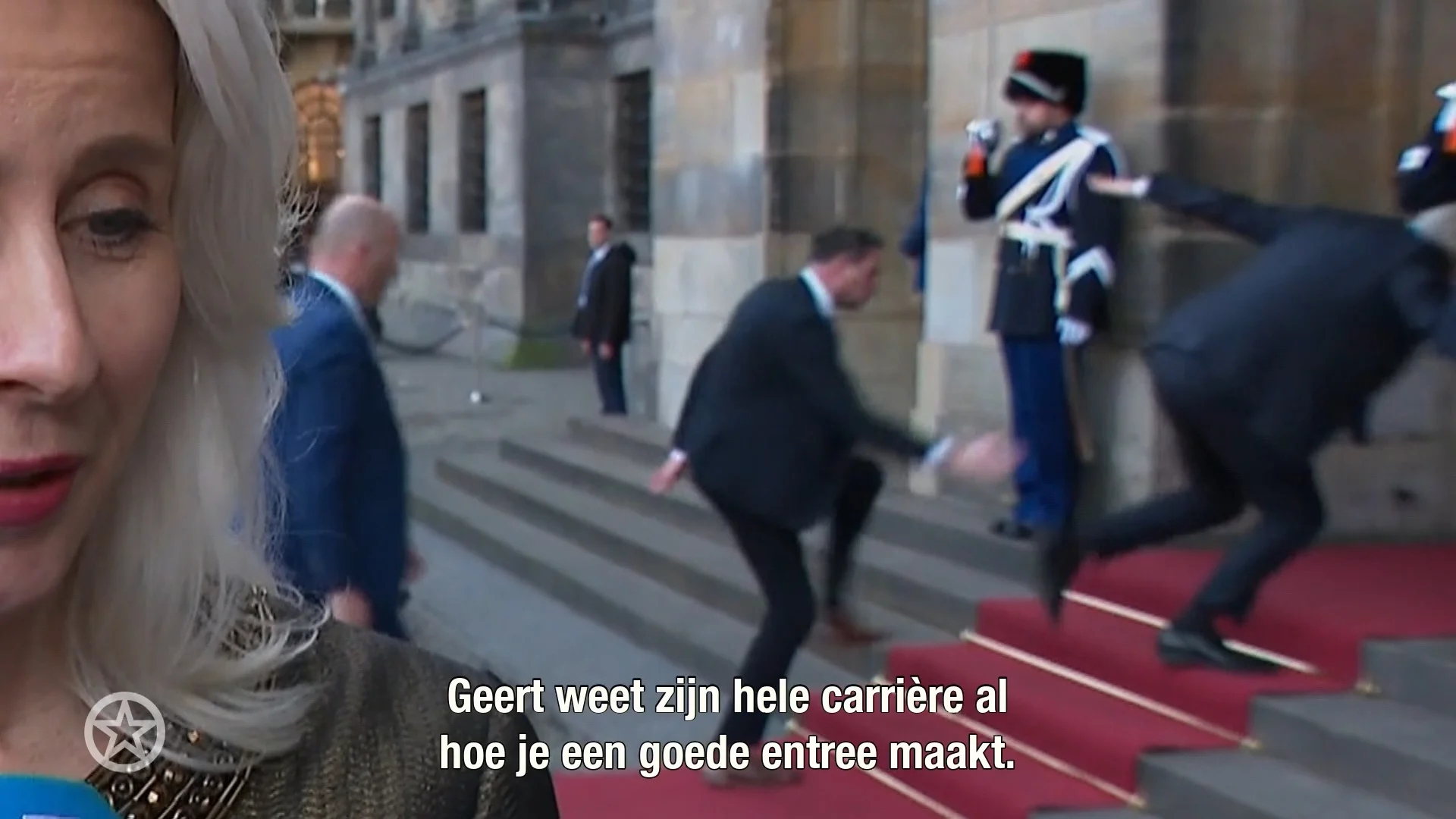 Geert Wilders struikelde maandag bij binnenkomst van het Koninklijk Paleis. Hij was daar voor de nieuwjaarsreceptie van het koningspaar...